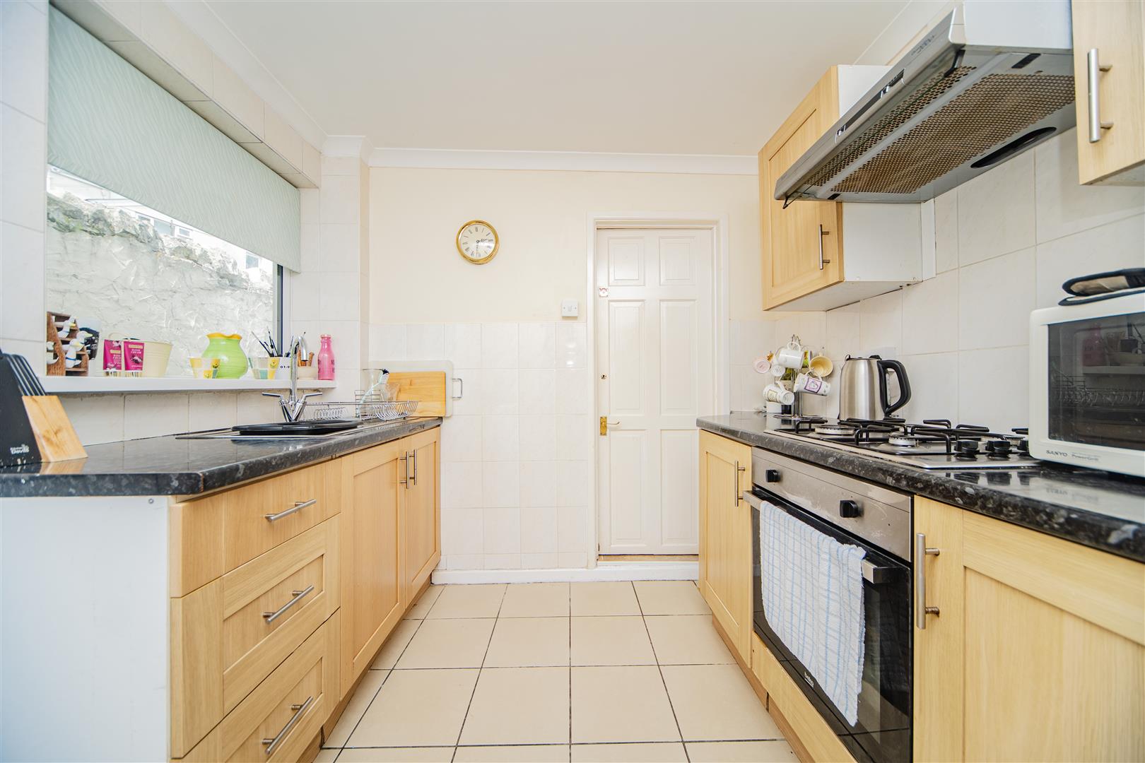 To the rear of the property is the kitchen, fitted with wood-effect units and black worktops, providing ample storage and workspace. From here, there is access to the rear garden, as well as a modern downstairs shower room with white sanitary ware and contemporary splash panels.