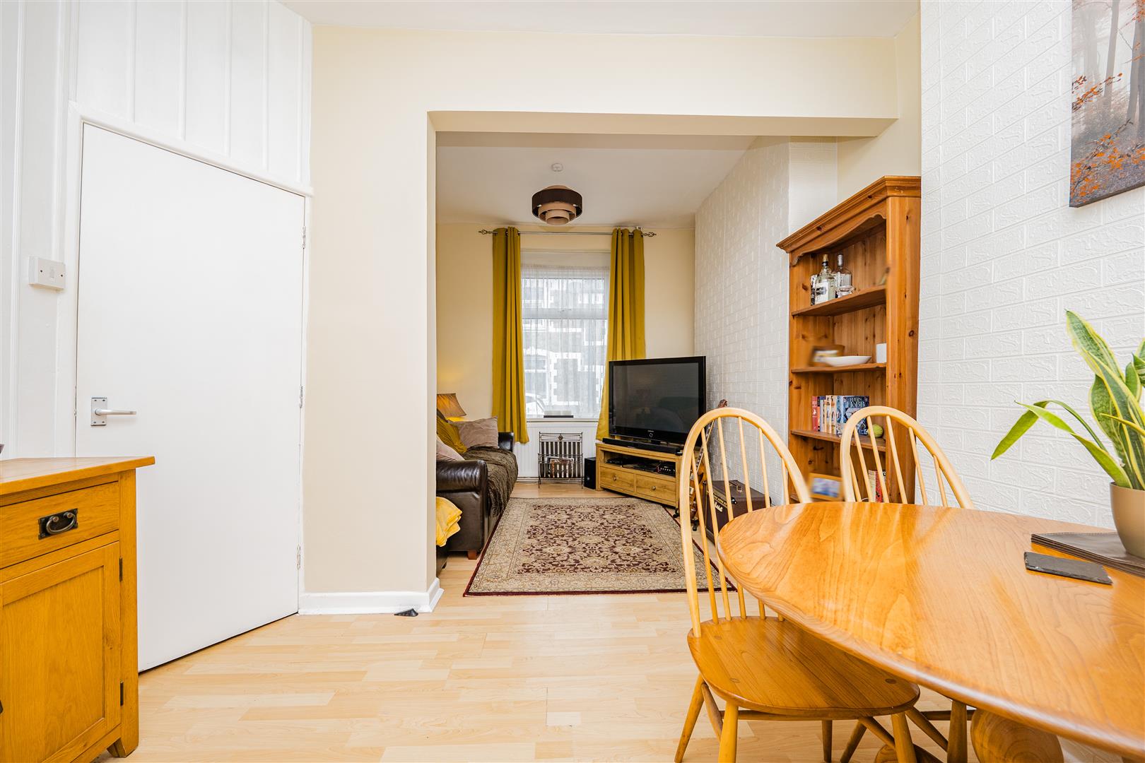 The kitchen is fitted with wooden cupboards and dark worktops, providing a functional cooking space. A practical link between the kitchen and bathroom provides space for laundry appliances and additional storage. To the rear of the property, the bathroom is fitted with a bath and overhead shower, complemented by a white toilet and sink.