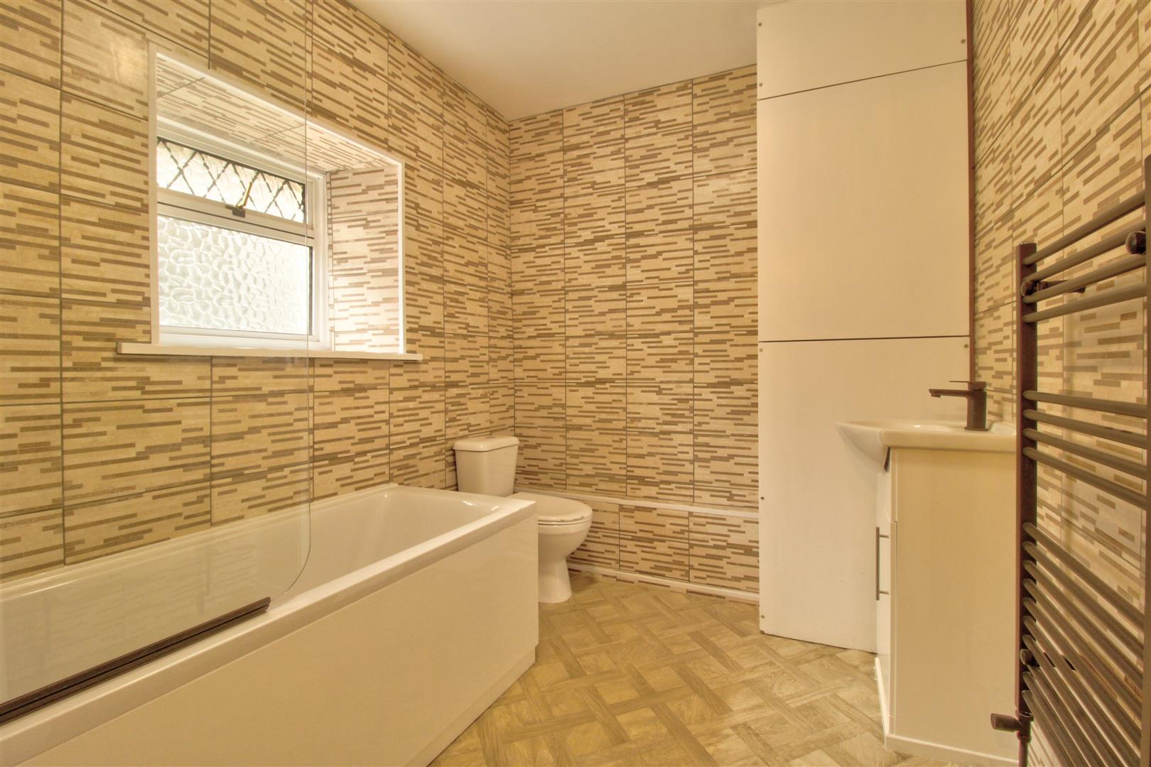 The first floor comprises two spacious bedrooms, both offering ample room for furnishings. The family bathroom is finished with neutral patterned wall tiles and wooden-effect flooring and includes a white suite comprising a toilet, wash hand basin, and a bath with overhead shower.
