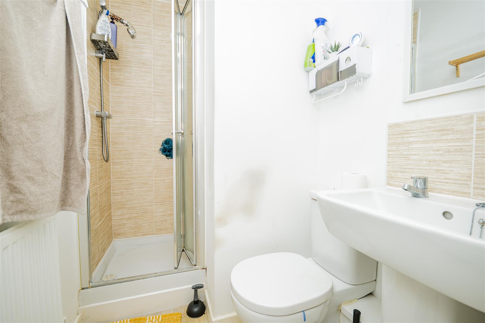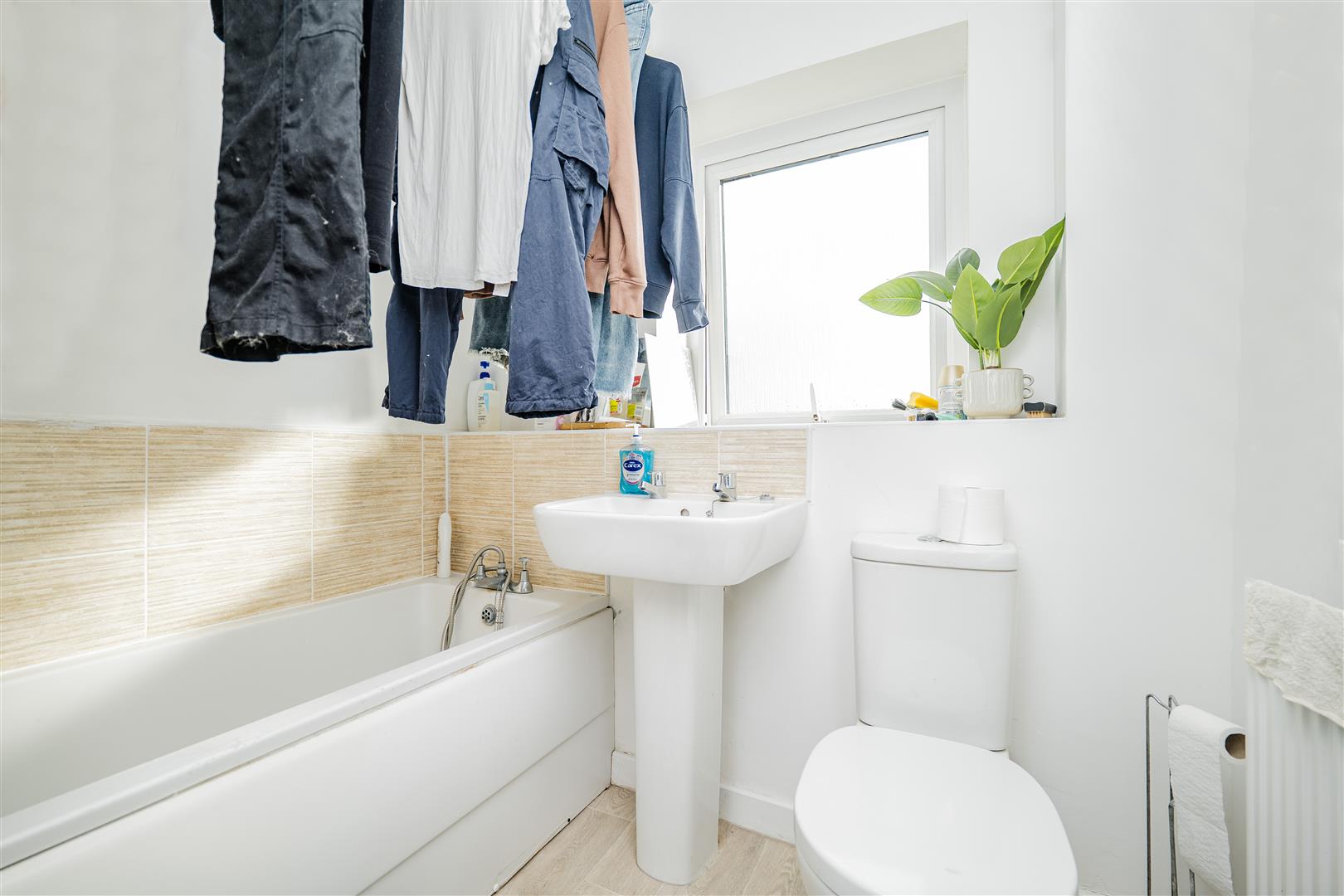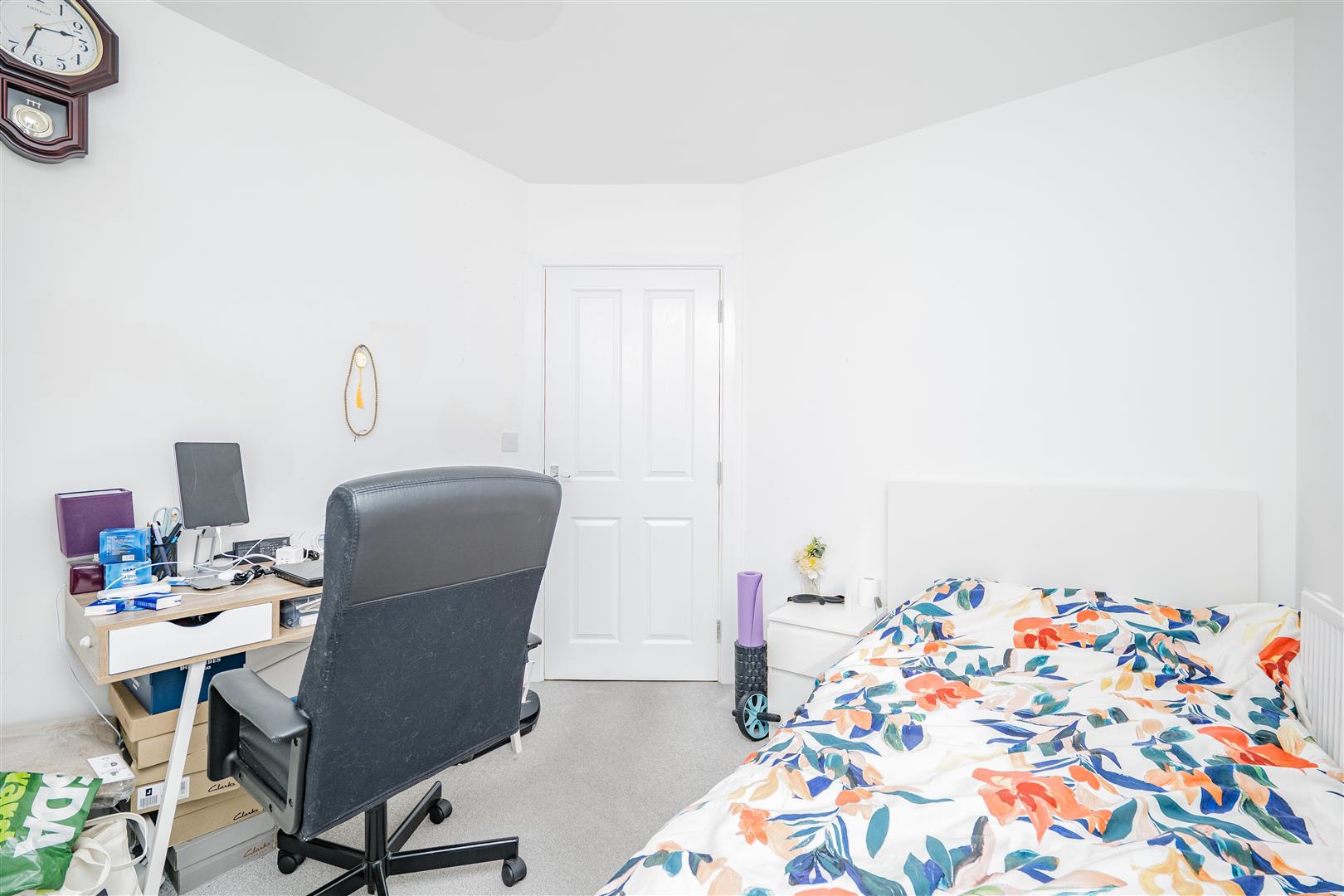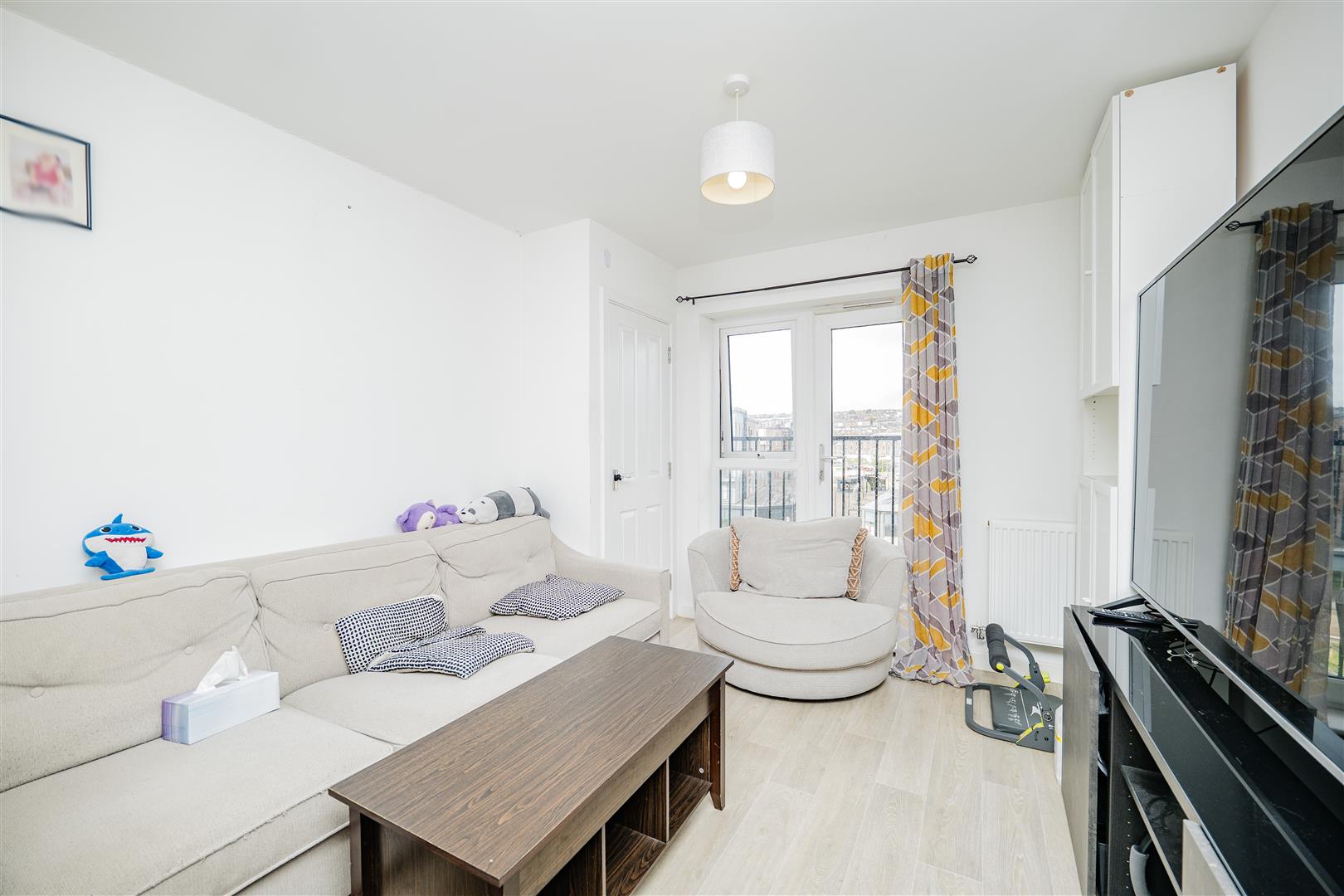 The apartment features two well-proportioned bedrooms, with the primary bedroom benefiting from a modern ensuite shower room finished with light-coloured tiles and flooring, creating a fresh and airy feel. The family bathroom complements the ensuite, offering a white suite with light tiles and flooring, maintaining the property’s clean and neutral aesthetic throughout.