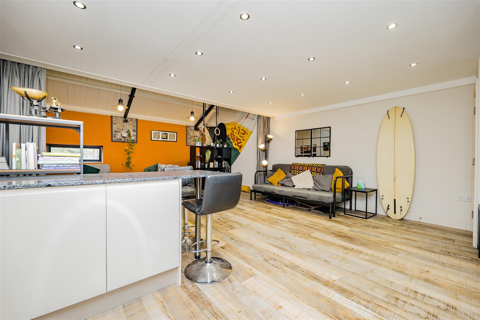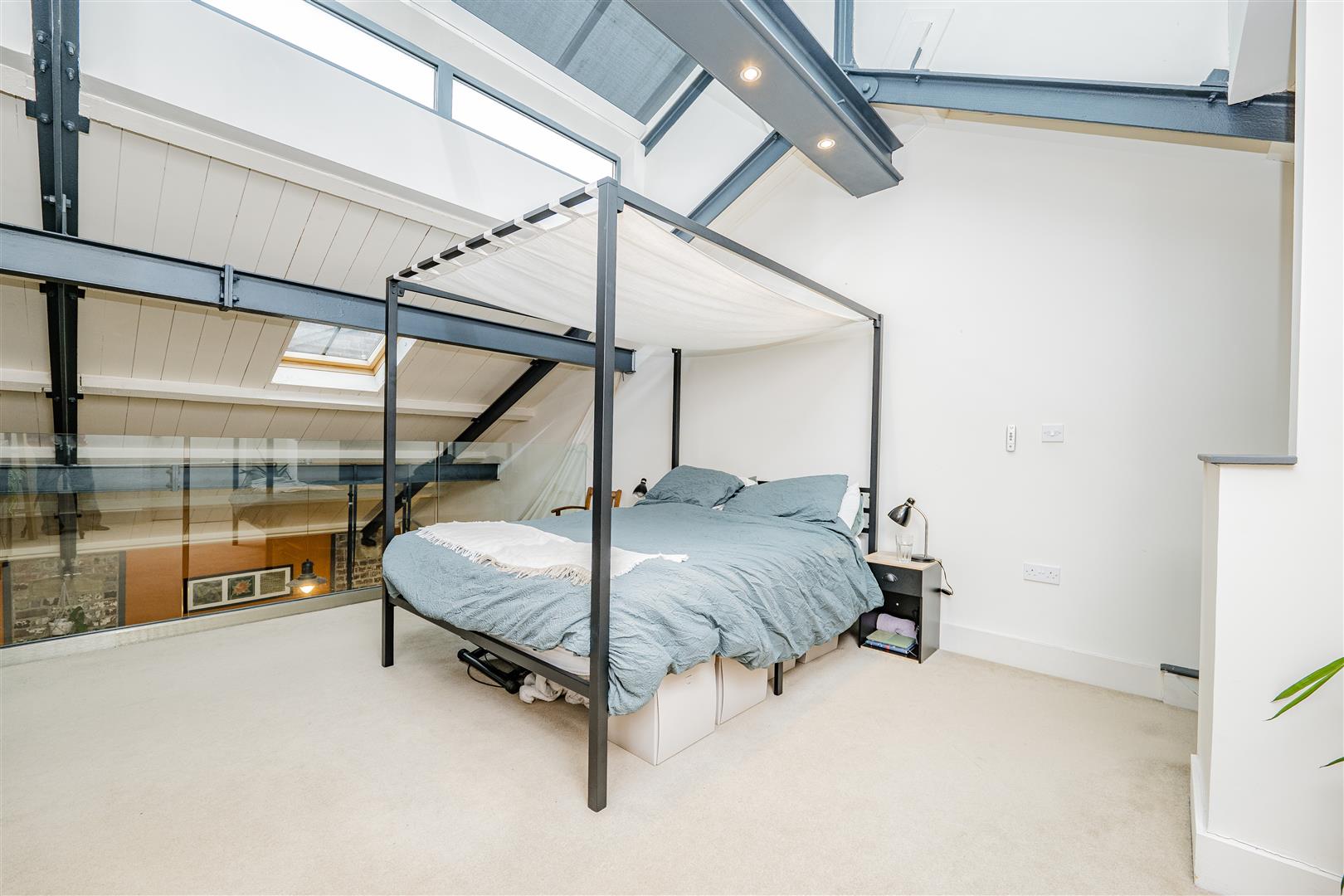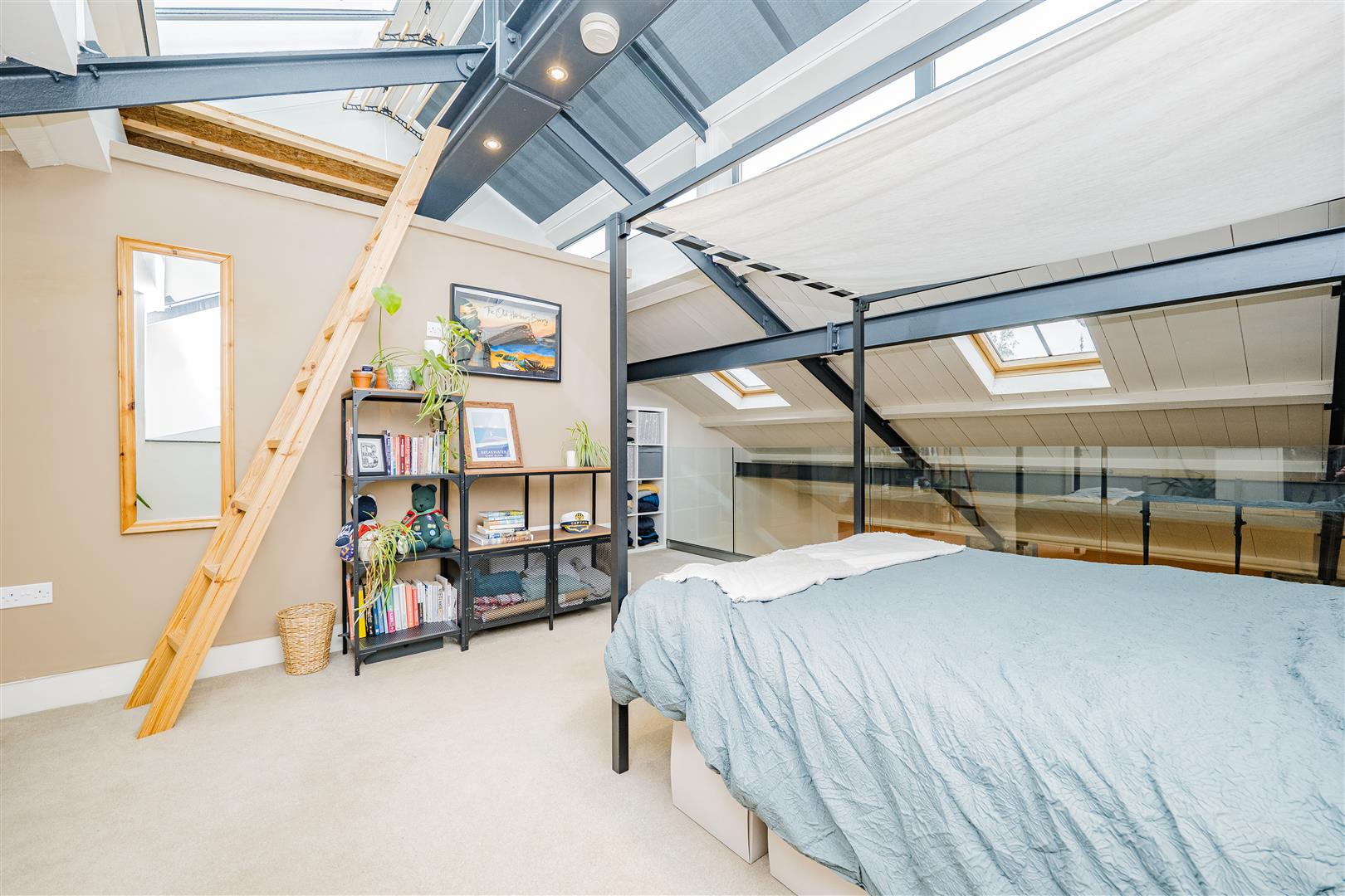 A feature staircase leads to the first floor, where you’ll discover a spacious mezzanine-style bedroom complete with a glass balcony overlooking the living area below. This stunning main bedroom offers a sense of luxury and space, complemented by a modern en-suite shower room with a vibrant blue finish and built-in wardrobe space.