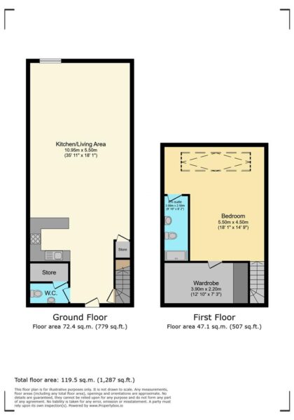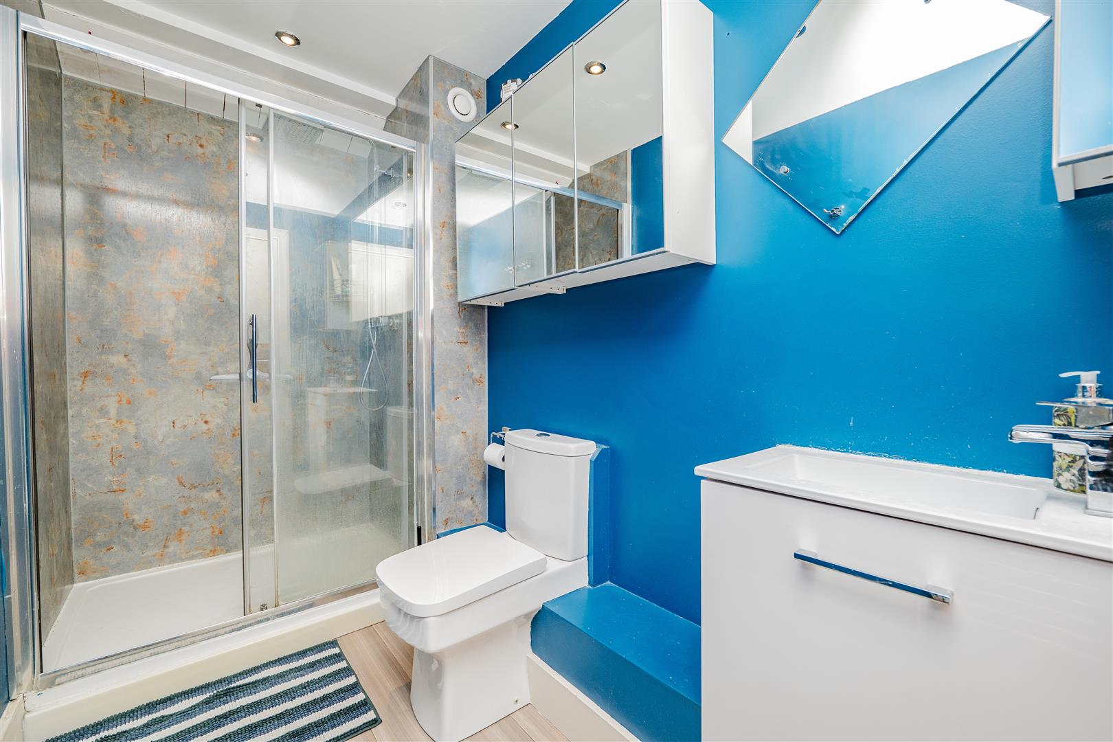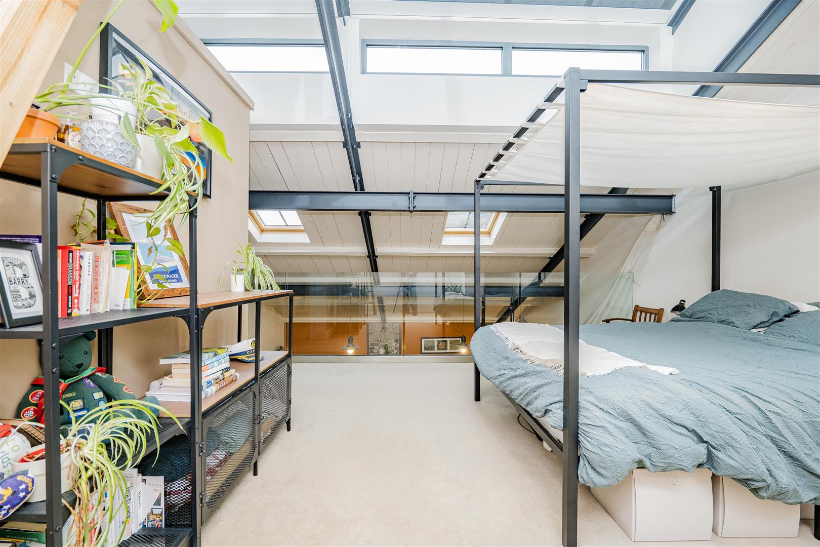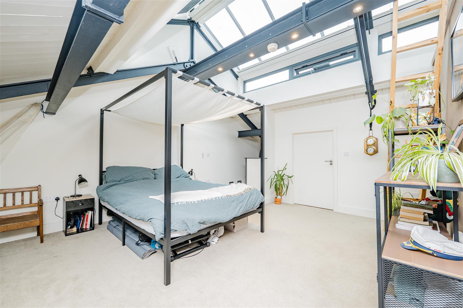 A feature staircase leads to the first floor, where you’ll discover a spacious mezzanine-style bedroom complete with a glass balcony overlooking the living area below. This stunning main bedroom offers a sense of luxury and space, complemented by a modern en-suite shower room with a vibrant blue finish and built-in wardrobe space.
