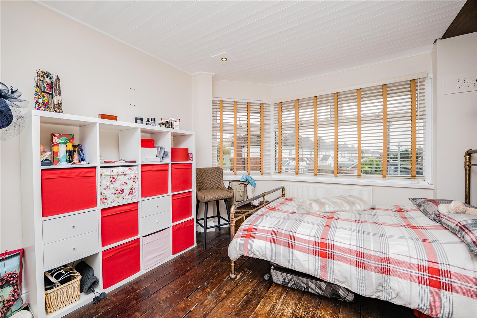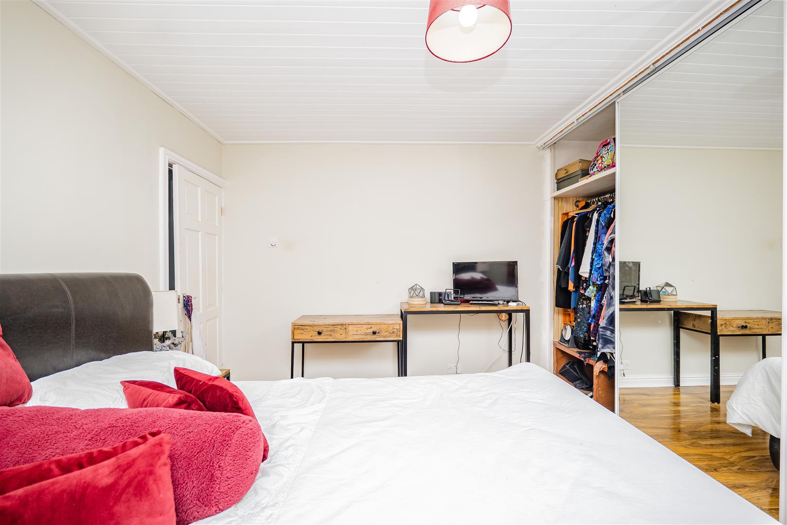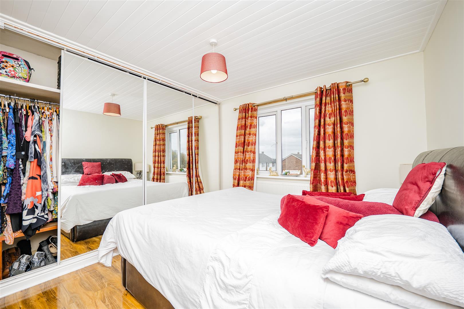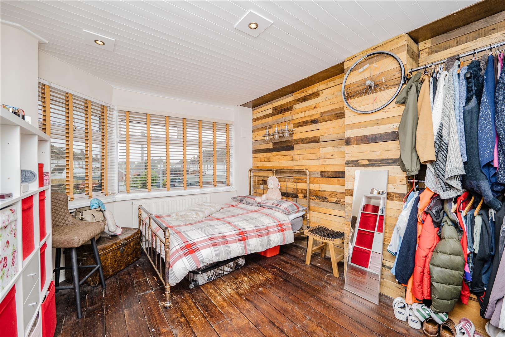 Upstairs, you’ll find three well-proportioned bedrooms. The first bedroom benefits from fitted wardrobes and wooden-effect flooring, while the second bedroom features darker wood flooring and a bay window. The family bathroom comprises a bath with overhead shower, a white suite including toilet and sink, and a clean, bright aesthetic.