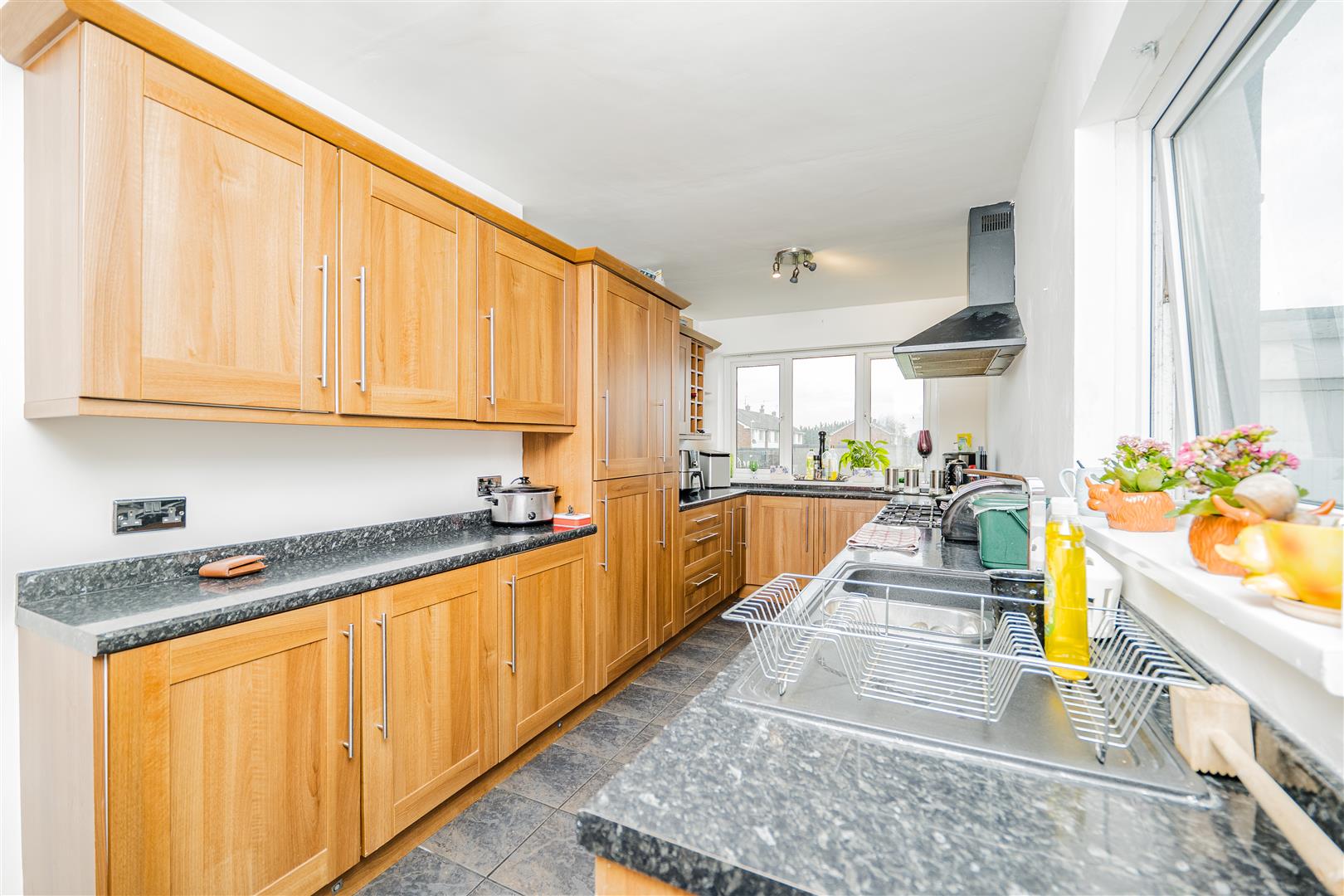 The kitchen is a fantastic size, fitted with wood-effect cupboards and contrasting black and grey worktops, providing ample storage and workspace. It also accommodates a double oven, while the under-stairs cupboard neatly houses both a washing machine and tumble dryer, keeping them conveniently tucked away.