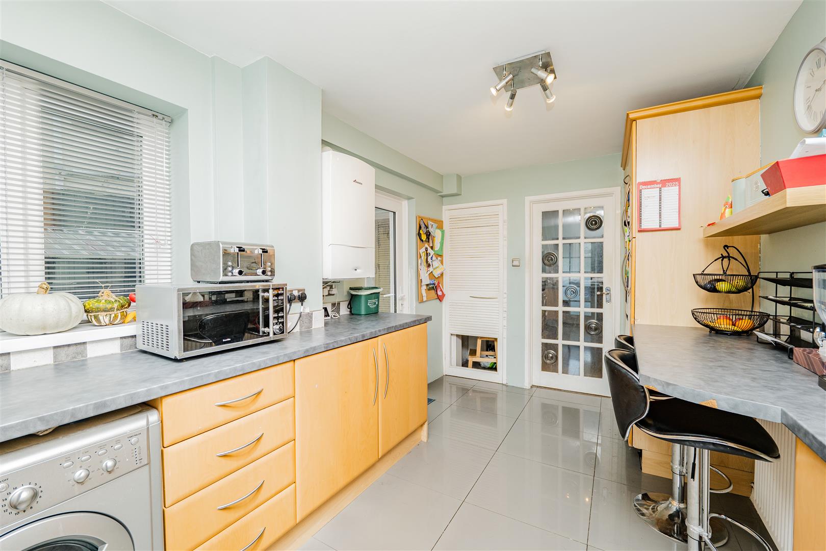 The kitchen is another strong feature of the property. Generous in size, it is fitted with wood-effect cabinetry and grey worktops, offering plenty of work surface and storage. A practical breakfast bar adds extra versatility, and a door provides side access to the rear garden. The kitchen also includes access to a handy under-stairs storage cupboard.