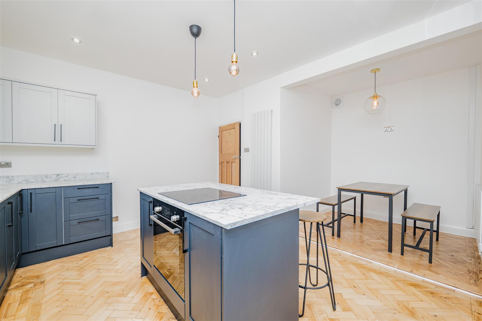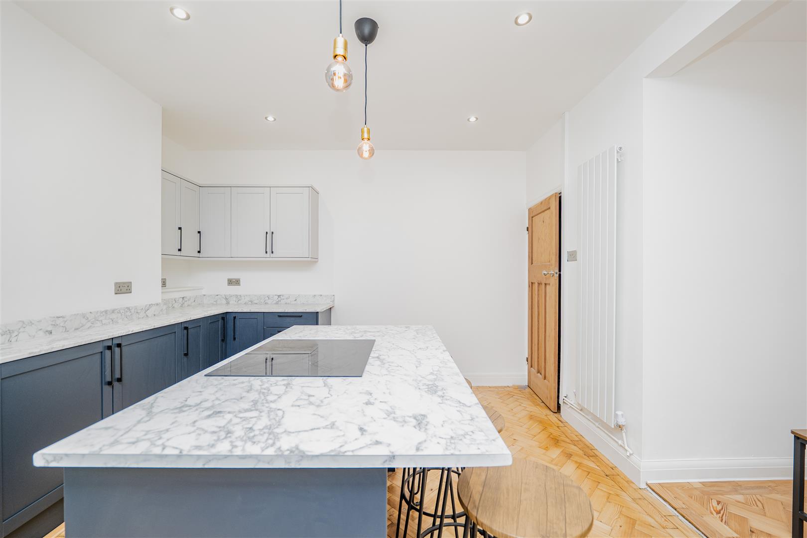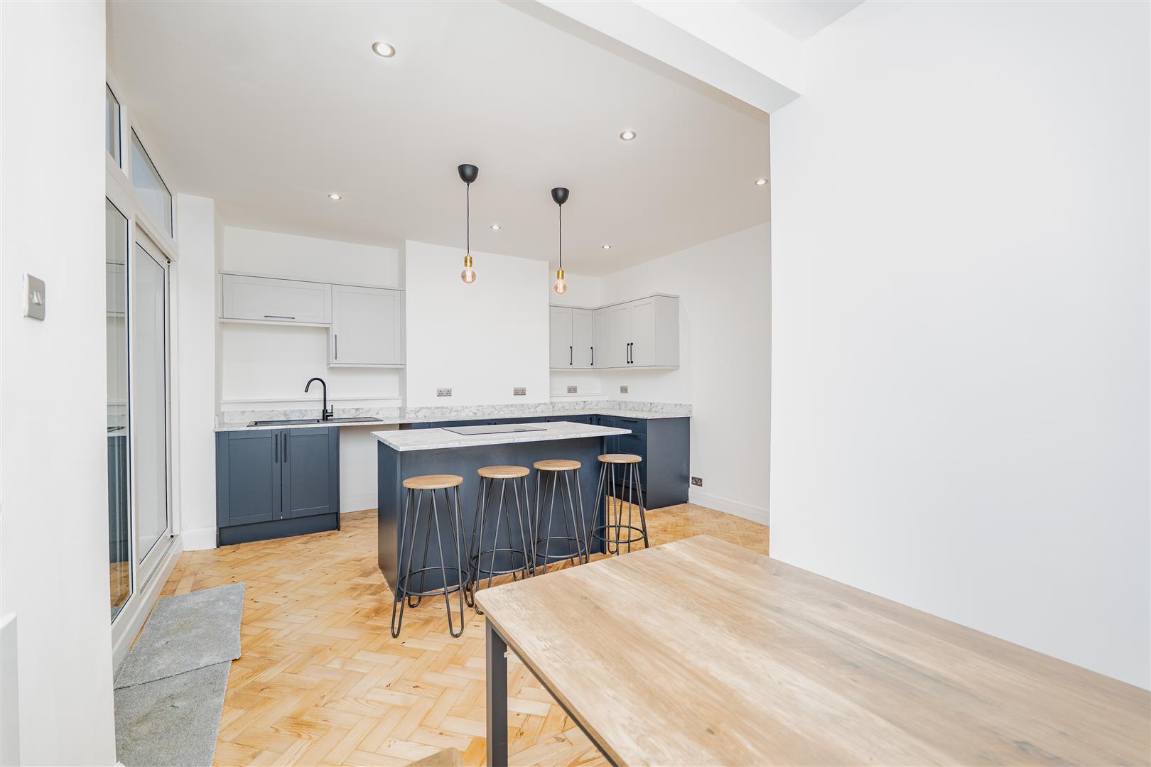 To the rear, the stunning kitchen/diner seamlessly continues the parquet flooring, enhancing the sense of flow throughout the ground floor. The kitchen is fitted with a lovely mix of blue and white units, complemented by white and grey marble-effect worktops. A central island with a fitted oven and hob forms a real focal point, while there is ample space for a dining table. Patio doors allow light to flood the room and provide direct access to the rear garden.